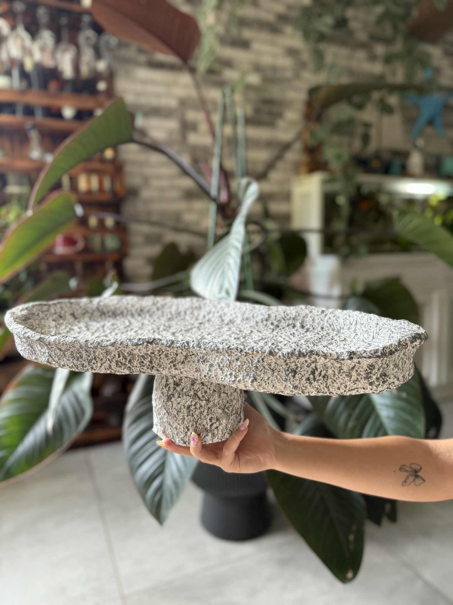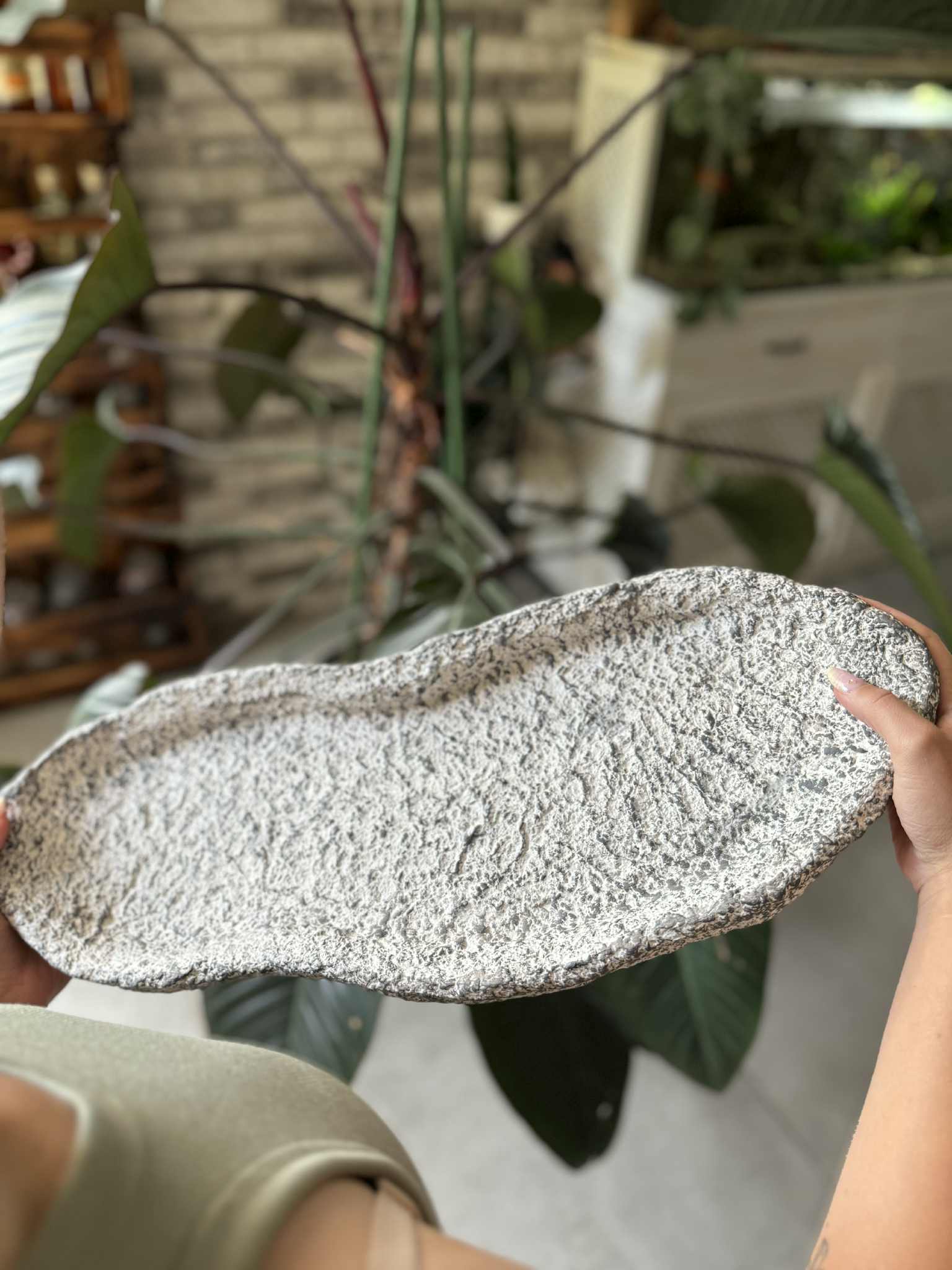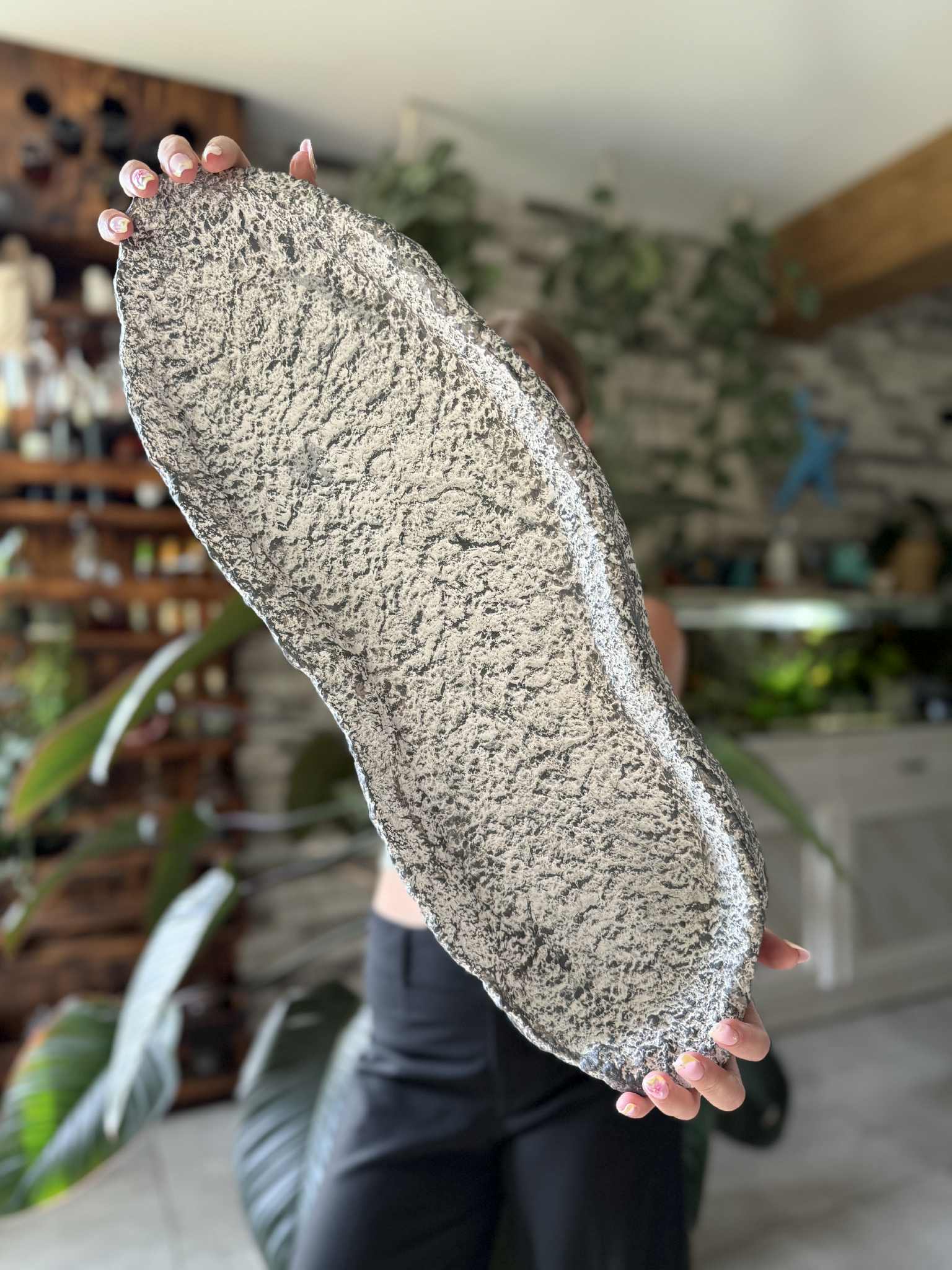 Ręcznie wykonana patera dekoracyjna z papier mâché, inspirowana strukturą naturalnego kamienia. Jej surowa faktura i nieregularna forma sprawiają, że przypomina rzeźbę, a jednocześnie pełni funkcję praktycznej ozdoby.