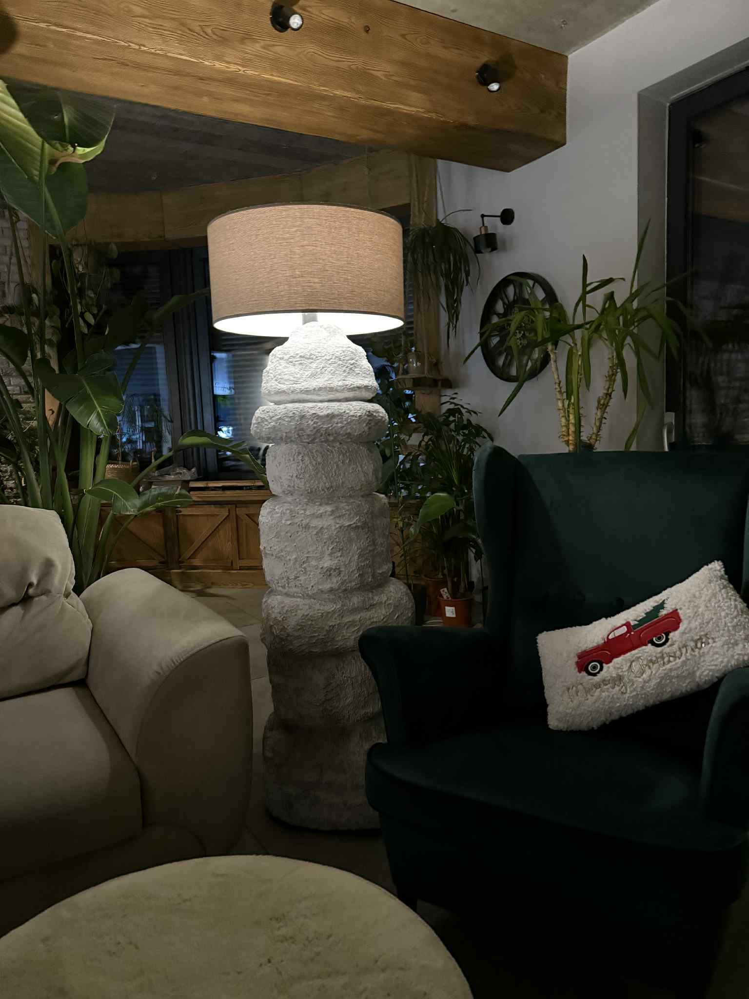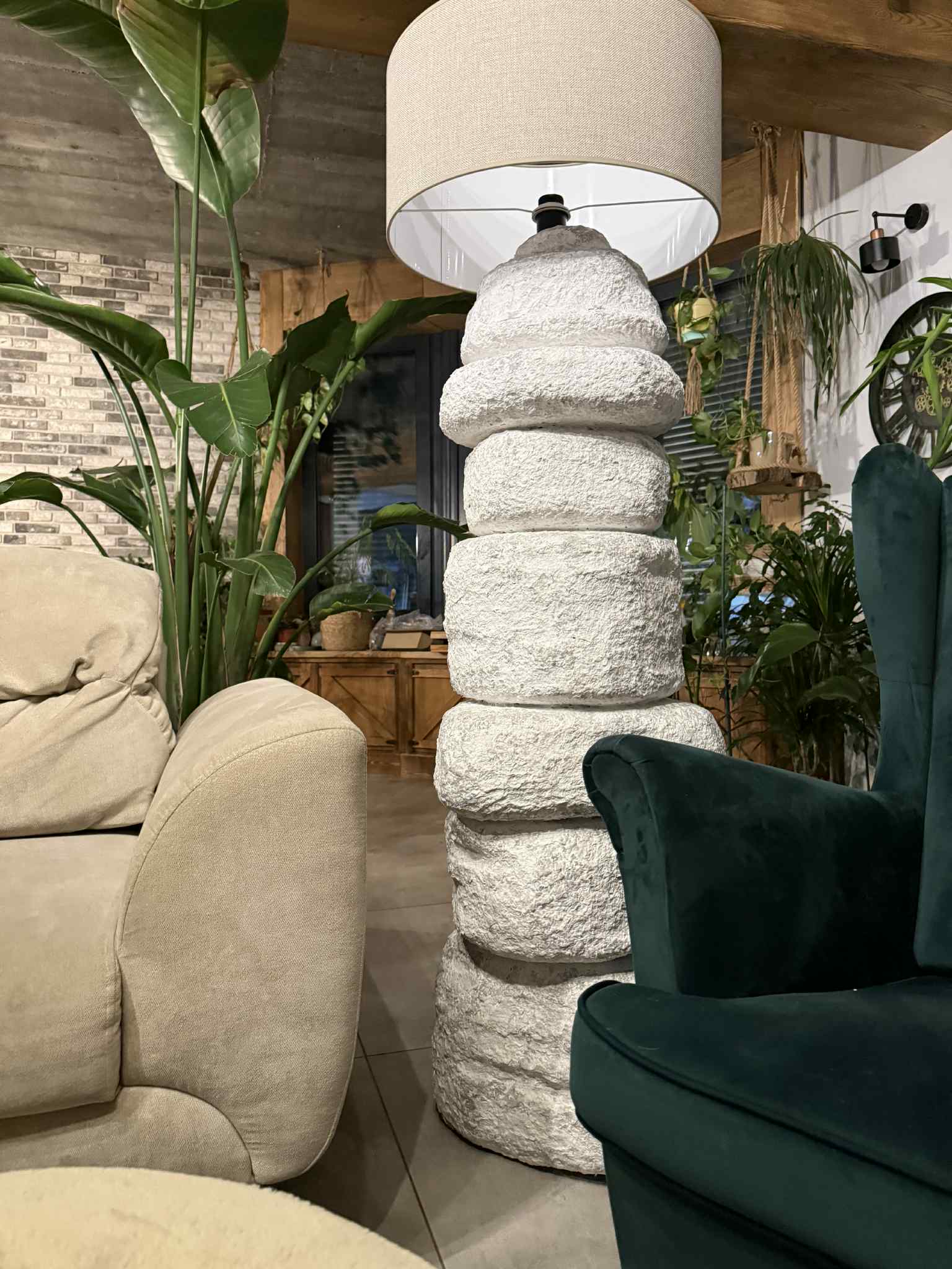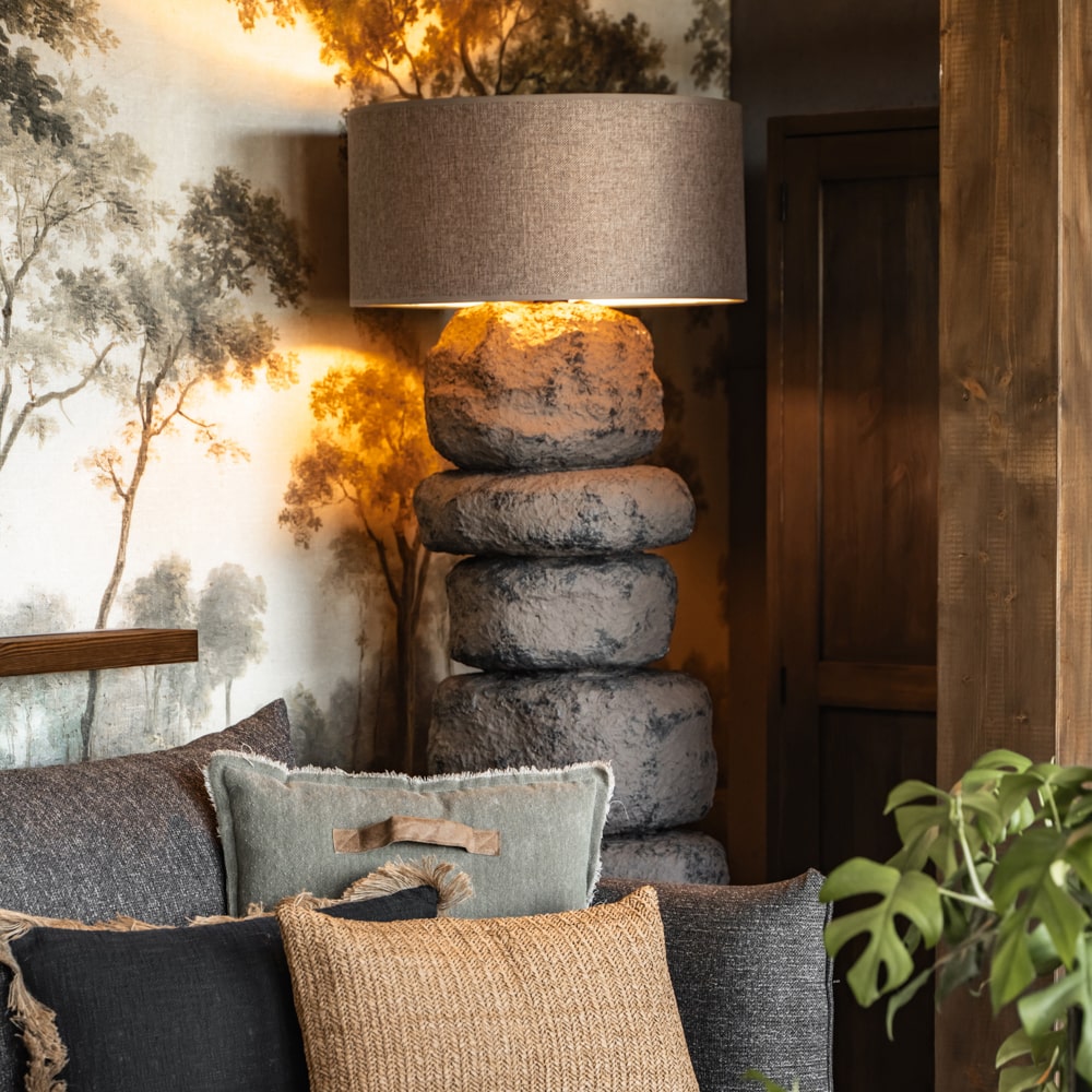 Papier mâché pozwala uzyskać wizualną „ciężkość kamienia” przy zachowaniu lekkości konstrukcji, dzięki czemu lampa jest łatwa w ustawieniu i bezpieczna w użytkowaniu.